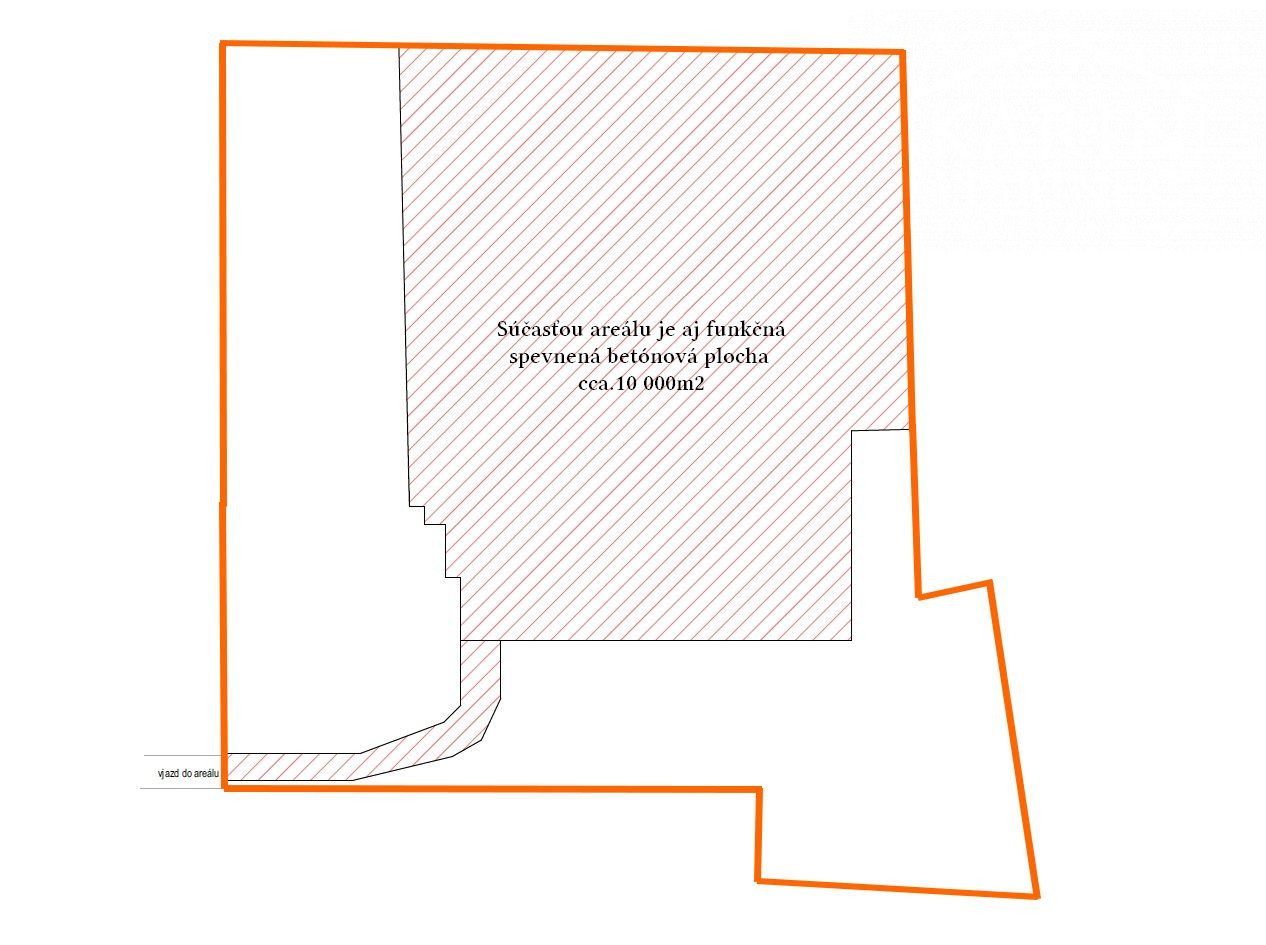 Výrobno-priemyselný areál betonárky je aktuálne až vo výmere vyše 10 000m2 vystavaný vybetónovanou spevnenou plochou / platňou o hrúbke v priemere 40cm, vrátane vystuženia armovacími železnými týčami. Jedná sa značné množstvo kvalitného zhutneného /vibrovaného/ betónu, ktorý len sám o sebe vo finančnom vyjadrení objemu použitého materiálu a ceny za vyhotovenie tejto platne-spevnenej základovej plochy, predstavuje hodnotu vo výške cca.731 tis. EUR ! Pre budúceho investora môže byť funkčné využitie takejto velkej spevnenej plochy, vystavanej funkčnej a kompaktnej BETÓNOVEJ PLATNE, výborným základom budúceho investičného zámeru.