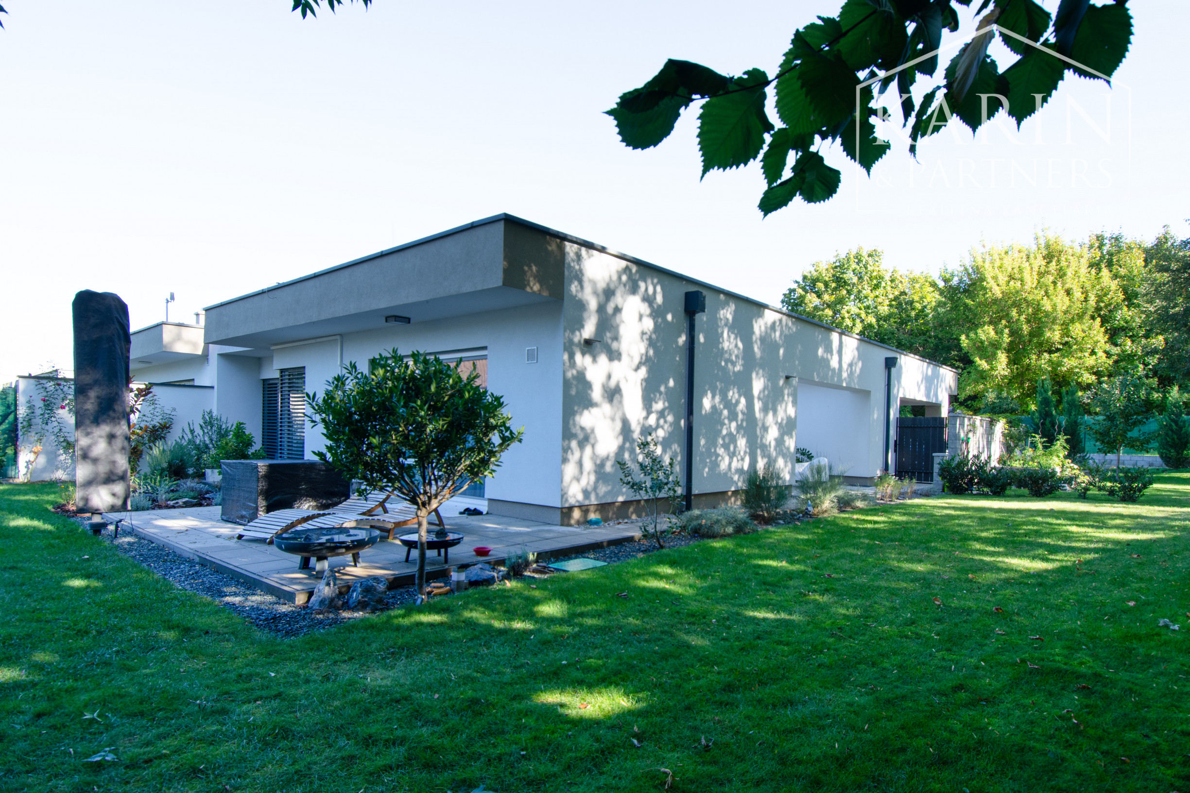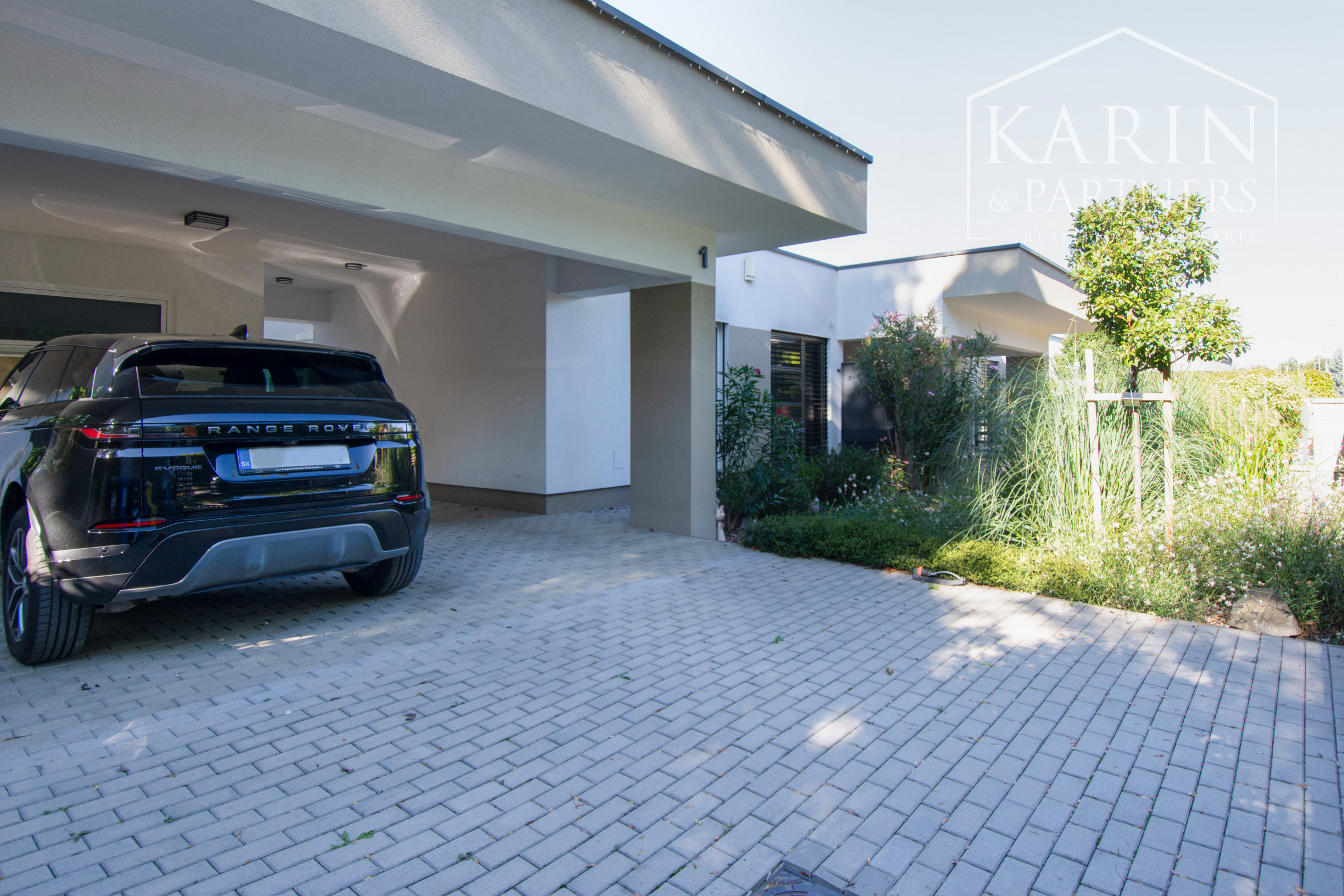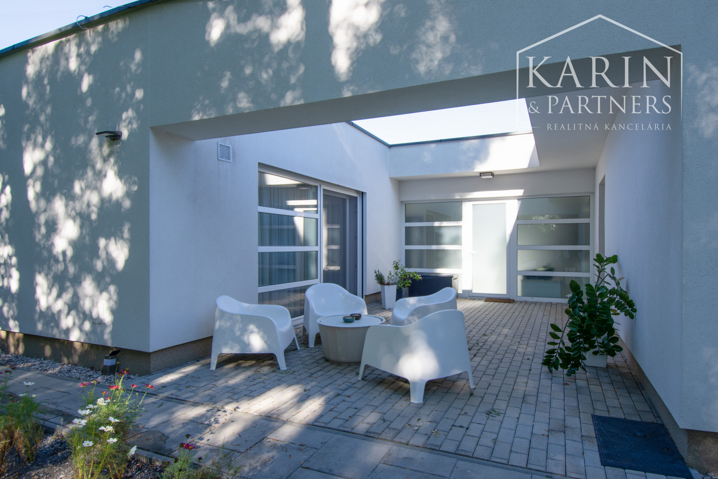 Dom má k dispozícii pekné a priestranné átrium kde sa nachádza aj šikovný sklad pre záhradné náradie a prístrešok pre dve autá.
