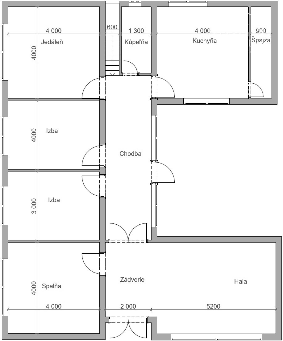 - 5 obytných izieb, 1 kúpeľňa so sprchovým kútom a WC, kuchyňa so špajzou, chodba v centálnej časti domu