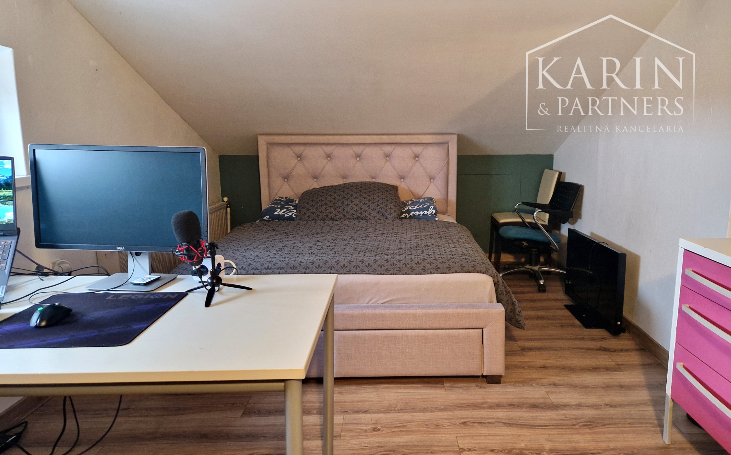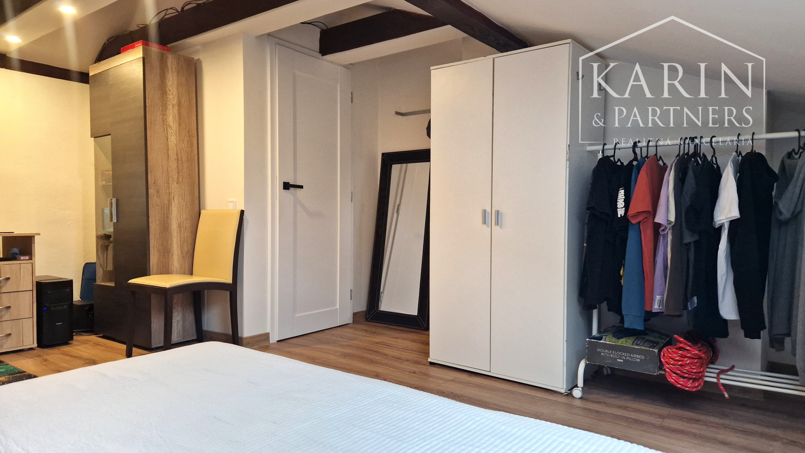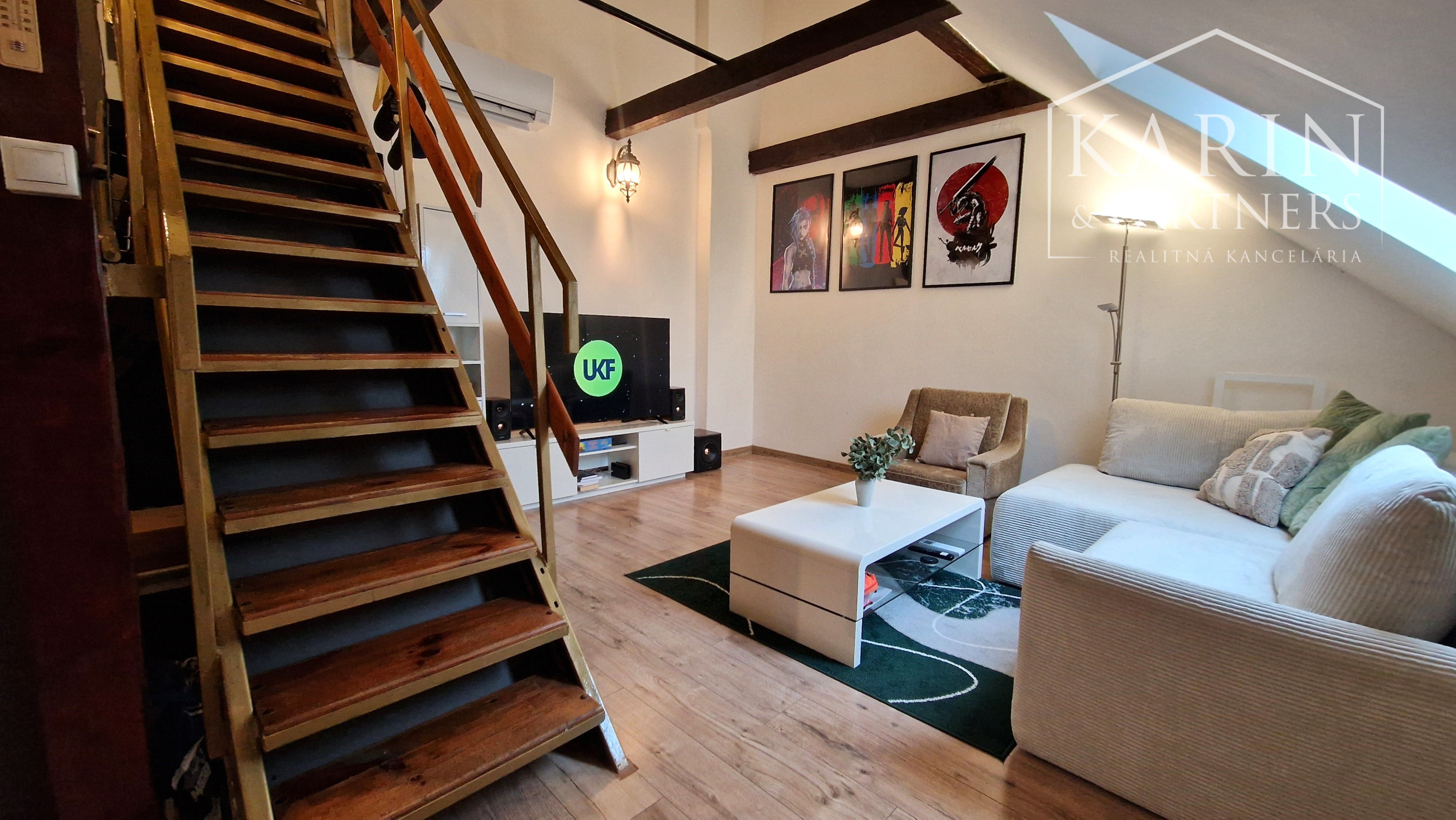 Byt sa nachádza na 2. poschodí domu bez výťahu, v centre obce Rovinka, na Školskej ulici, v blízkosti ZŠ Rovinka. Pred bytom sú k dispozícií 3 vonkajšie parkovacie miesta, pri parkovaní za sebou. Celková výmera 85 m² poskytuje komfortné bývanie s prakticky riešenou dispozíciou. Byt pozostáva z obývacej izby prepojenej s kuchyňou a schodiskom, kúpeľne so sprchovým kútom a WC a dvoch samostatných podkrovných izieb umiestnených na poschodí. Obývacia časť je zariadená sedacou súpravou, TV stolíkom, televízorom a jedálenským stolom so stoličkami. Kuchynská linka je vybavená vstavanými spotrebičmi – elektrickou rúrou, mikrovlnnou rúrou, indukčnou varnou doskou a digestorom, doplnená o chladničku s mrazničkou a práčku (bez umývačky riadu). Vykurovanie bytu je zabezpečené klimatizáciou umiestnenou na spodnom podlaží, čo umožňuje efektívnu reguláciu teploty počas celého roka. Izby sú zariadené manželskými posteľami s úložným priestorom a šatníkovými skriňami.