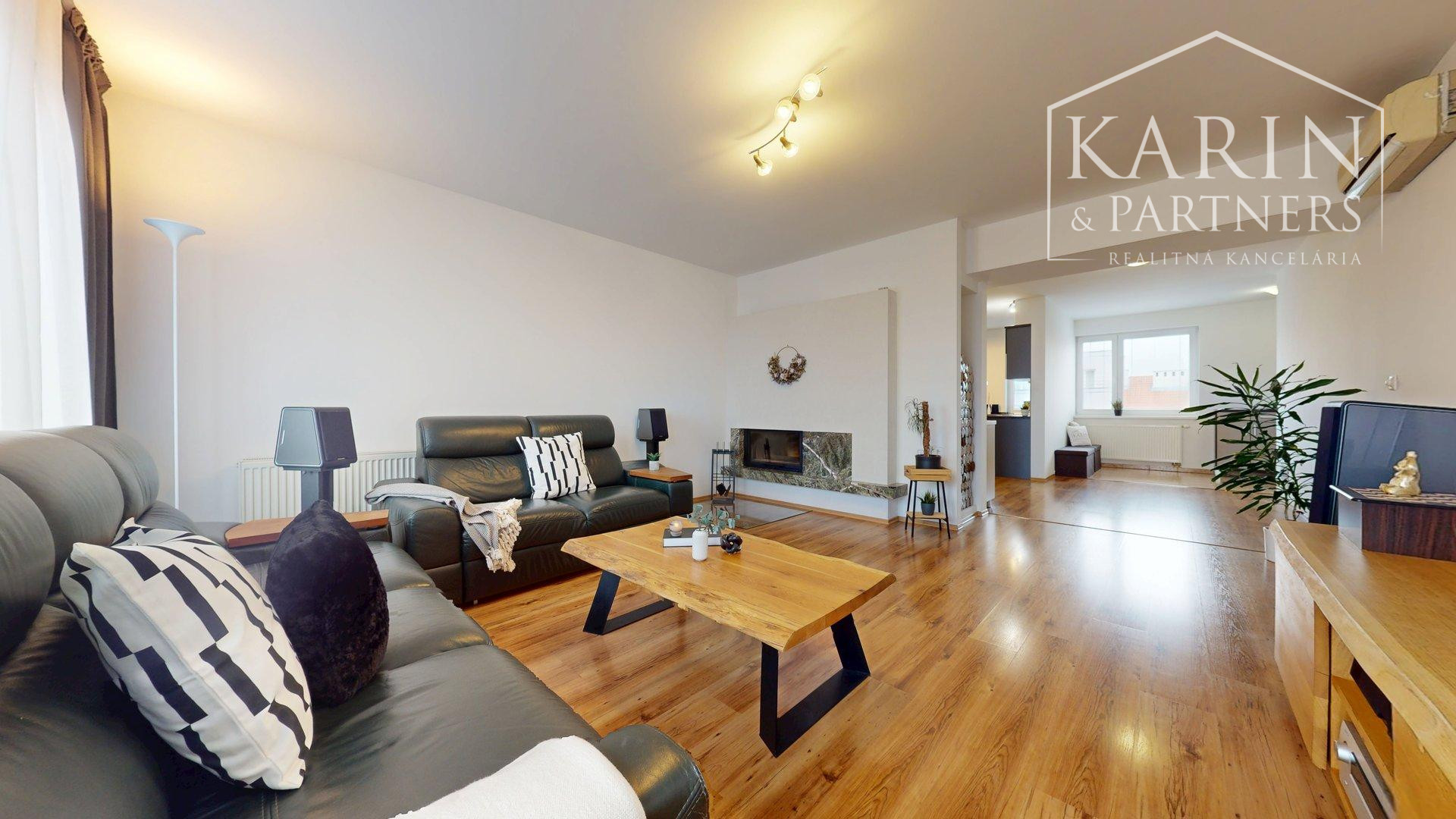 Po vstupe do bytu sa nachádzame vo vstupnej chodbe so skriňovou zostavou. Z chodby prechádzame vľavo do obývacej miestnosti, z ktorej je výstup na balkón. V obývacej izbe je umiestnený mramorový krb, ktorý je v prípade bytov výnimočným dizajnovým prvkom a dodáva priestoru neopakovateľné čaro.
