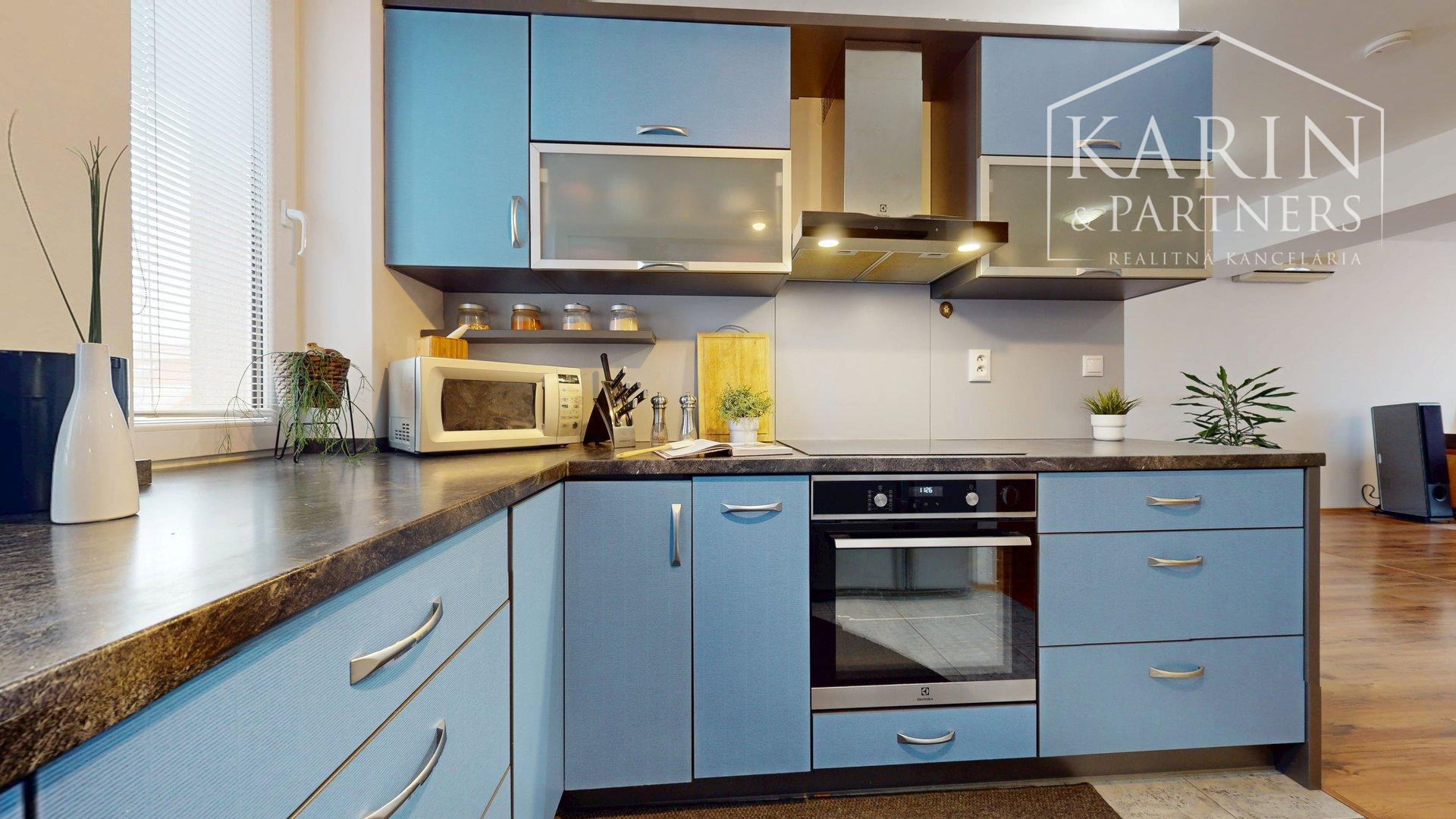 Plynulo na ňu nadväzuje jedálenská časť so stolom a skrinkami, vytvárajúca prirodzený prechod medzi obývacím priestorom a kuchyňou. Kuchyňa situovaná v pravej časti bytu je kompletne vybavená kvalitnými spotrebičmi vrátane chladničky s mrazničkou, indukčnej varnej dosky, elektrickej rúry a digestora, umývačky riadu aj mikrovlnnej rúry. Kuchyňa ponúka dostatok pracovnej aj úložnej plochy a bola navrhnutá s dôrazom na praktickosť.