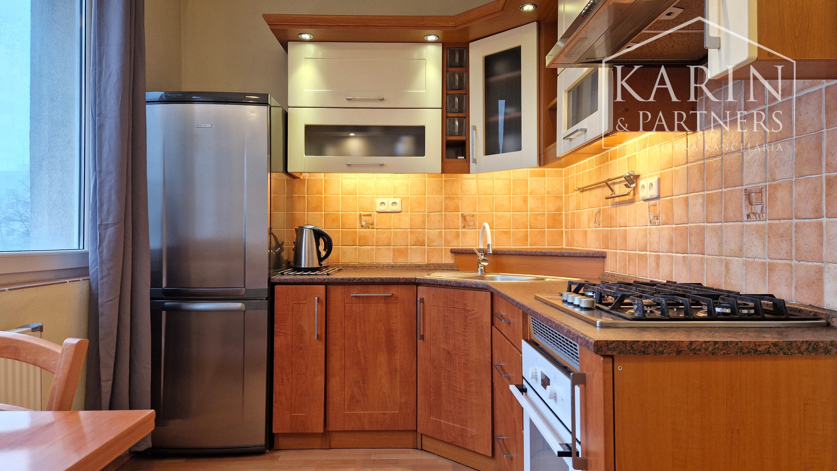 Kuchyňa je vybavená spotrebičmi: plynový sporák, elektrická dvojplatnička, elektrická rúra, chladnička s mrazničkou (bez umývačky riadu).