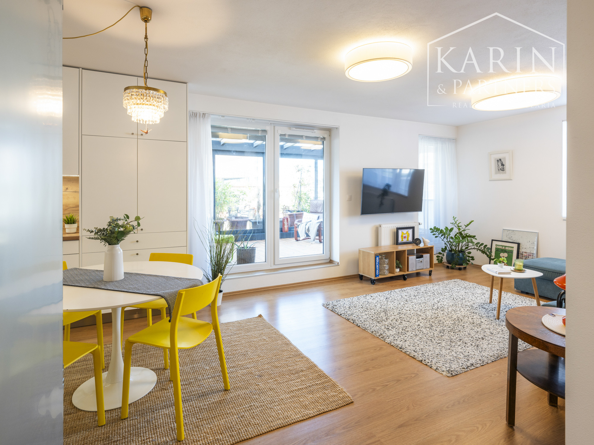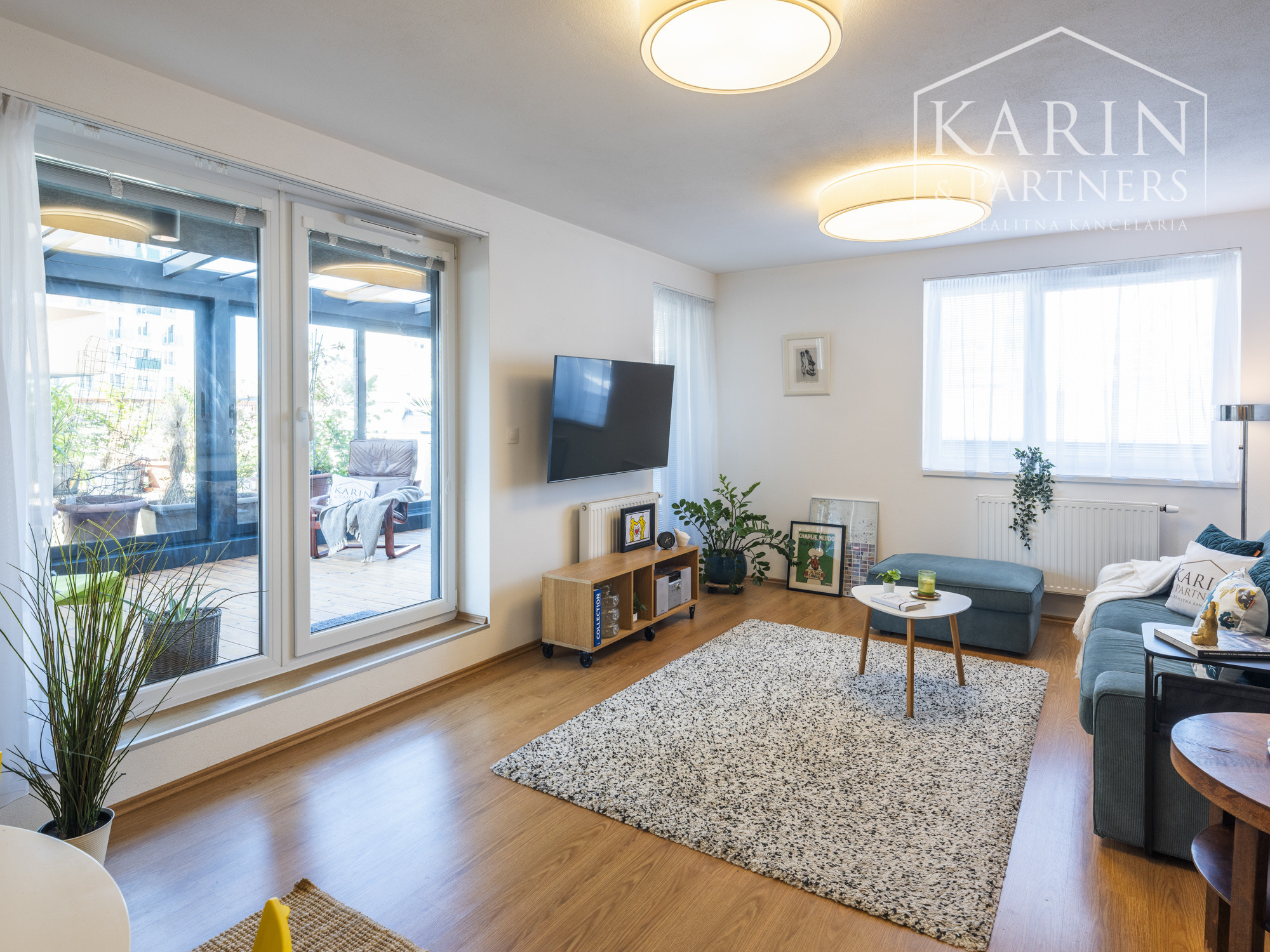 Denná časť bytu prirodzene prepája interiér s exteriérom – a práve tu tento byt vyniká.
