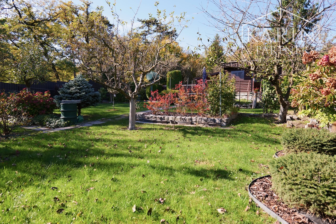 Pozemok je udržiavaný, vysadený okrasnými rastlinami a ovocnými stromami, čo vytvára príjemnú atmosféru a súkromie.