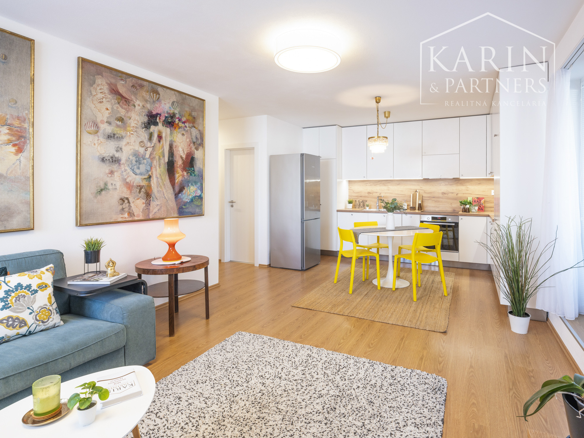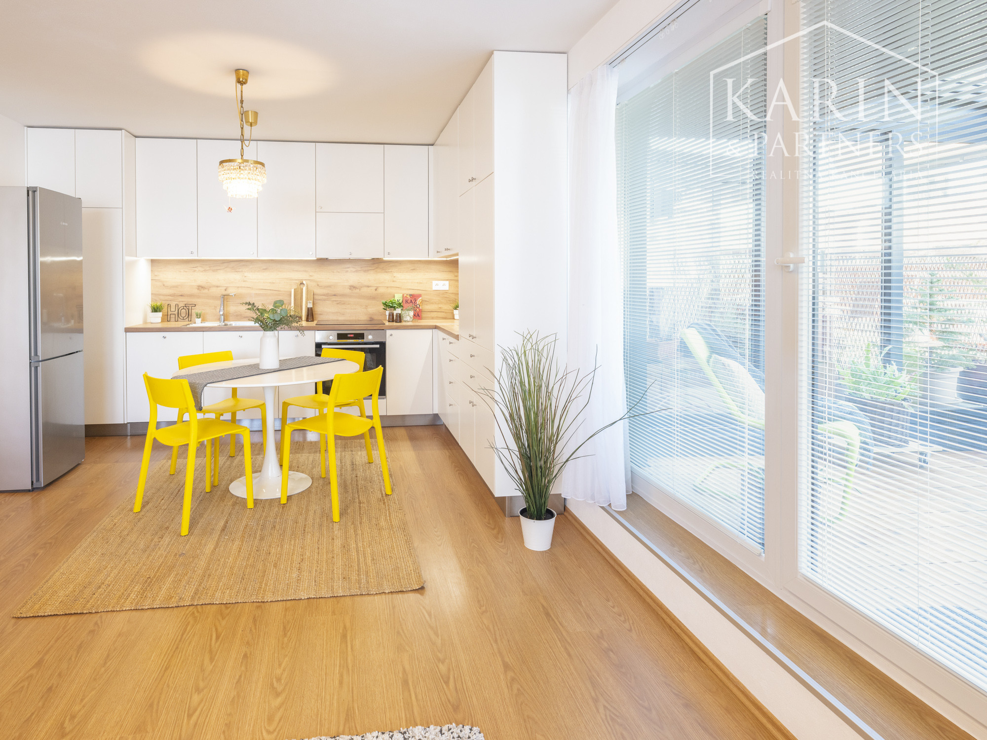 Denná časť bytu prirodzene prepája interiér s exteriérom – a práve tu tento byt vyniká.