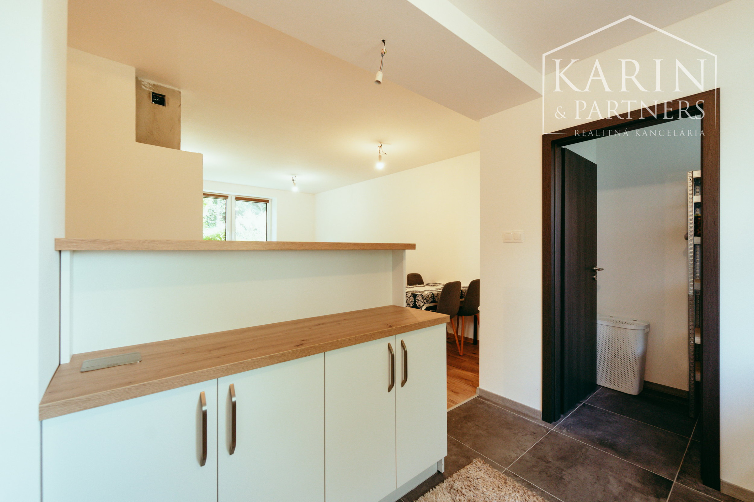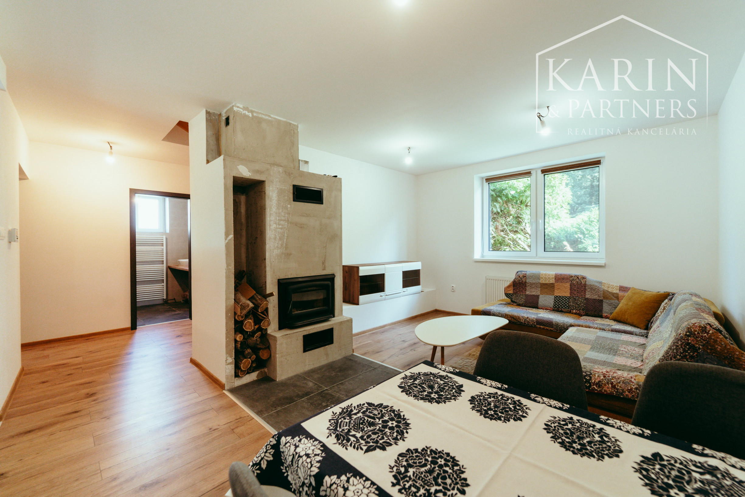 - dispozícia prízemia: predsieň, chodba so schodiskom na poschodie, kúpeľňa so sprchovým kútom, samostatné WC, technická miestnosť. Obývacia miestnosť s krbom a kuchynským kútom (kompletne vybavená spotrebičmi, americká chladnička), špajza.
