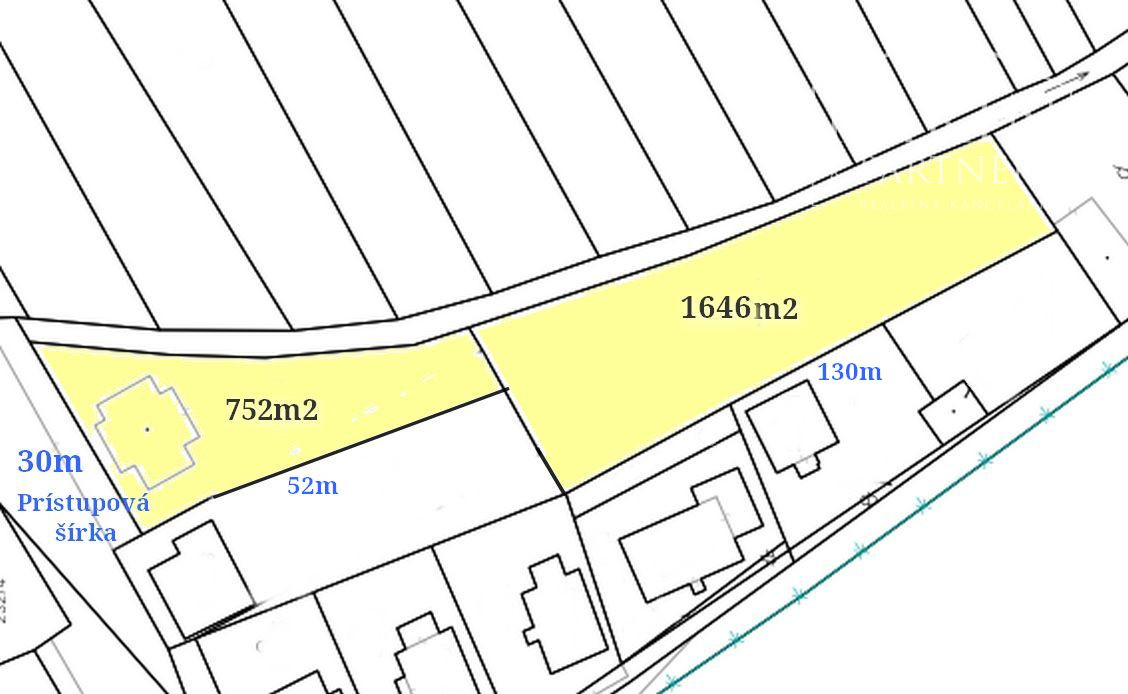 V prípade záujmu je možné na tomto pozemku postaviť tri alebo štyri rodinné domy, avšak predaj je možný nedeliteľne len v celosti a v plnej výmere 2398m2, tak ako sa inzeruje.