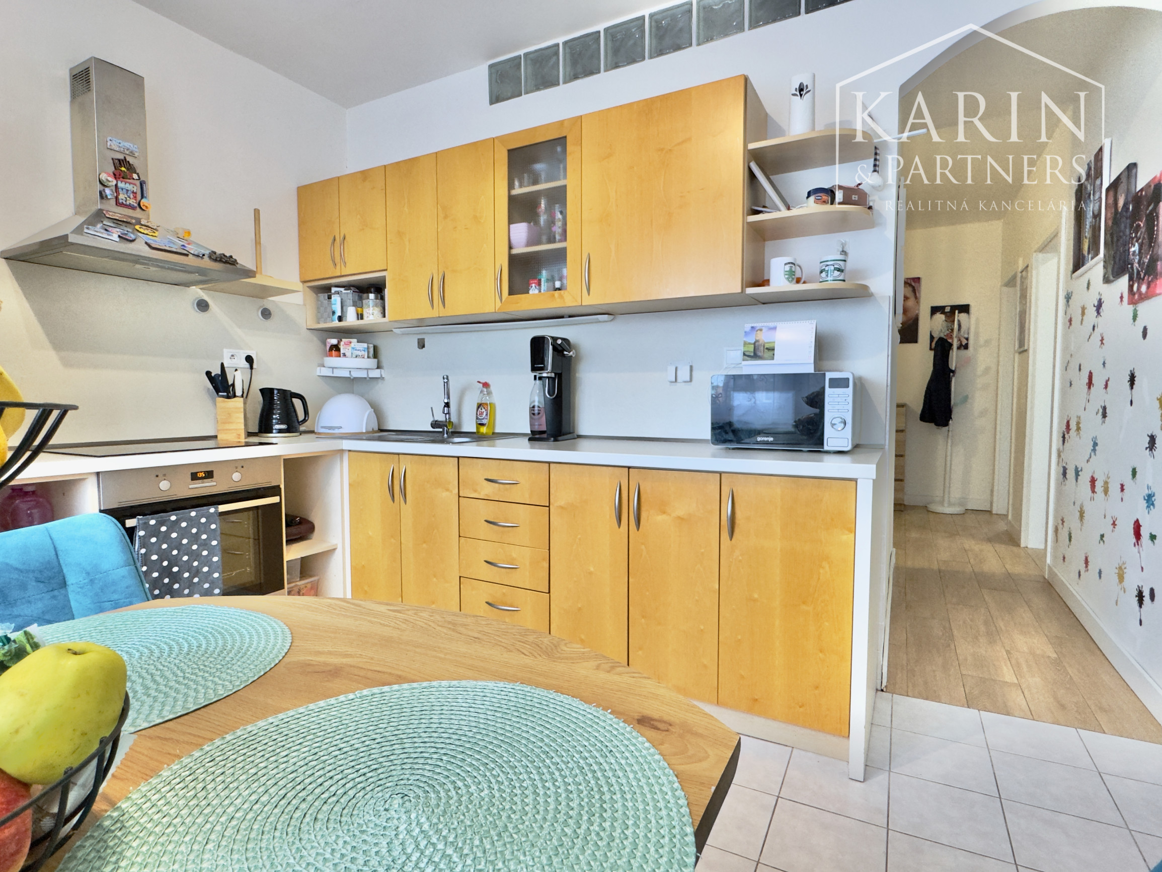 - Kuchyňa: Presvetlený priestor s nadčasovou kuchynskou linkou, vstavanou rúrou, varnou doskou a digestorom.