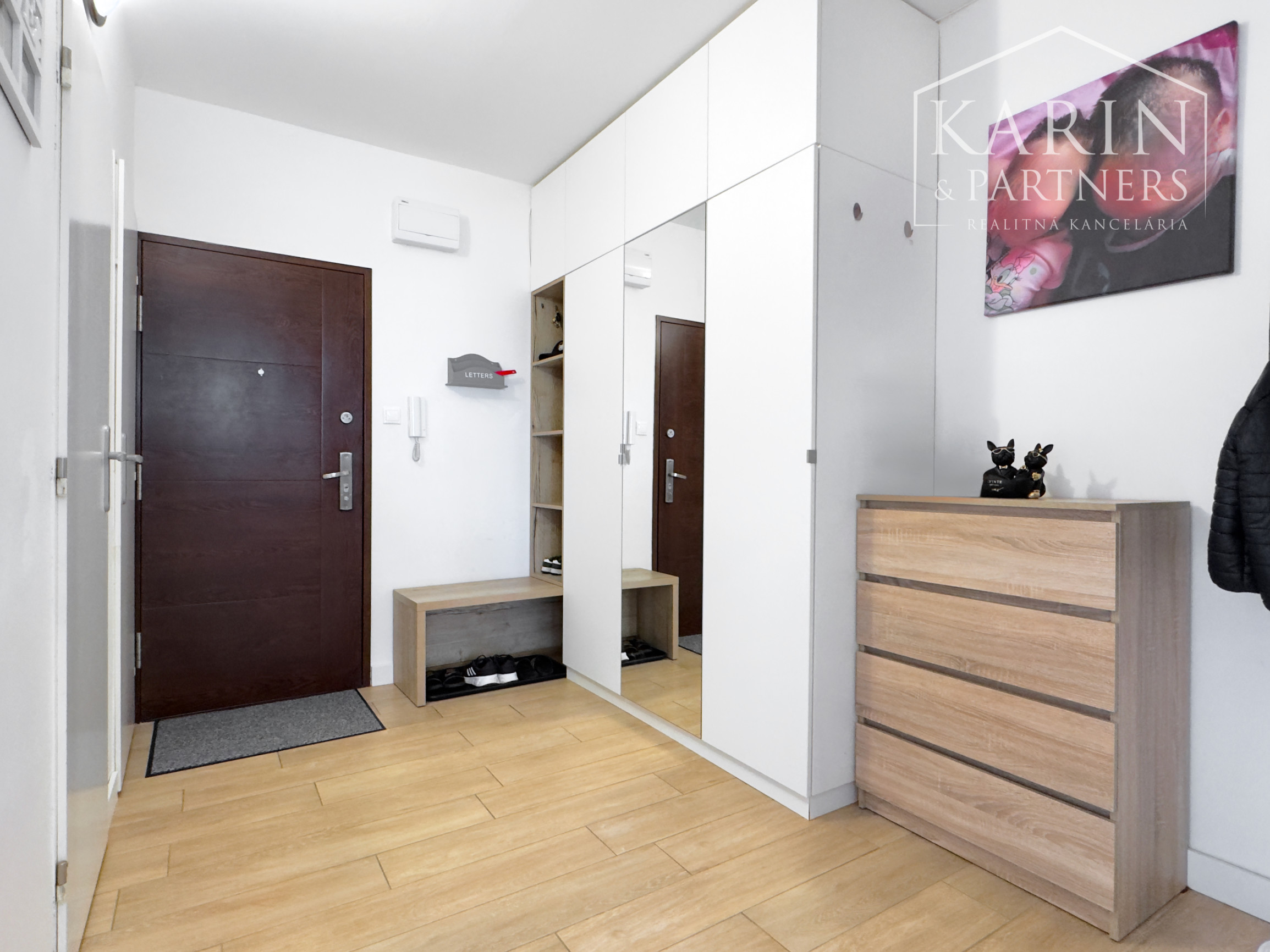 - Chodba: Na mieru robená vstavaná skriňa v bielej farbe so zrkadlami, ktorá opticky zväčšuje priestor.