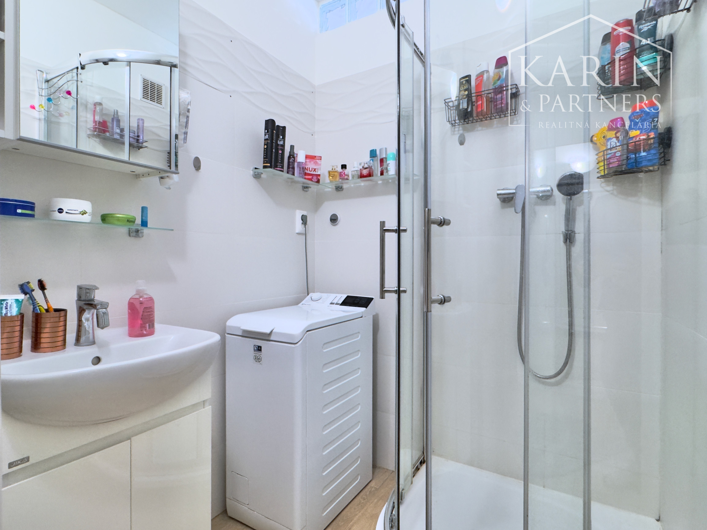 - Kúpeľňa: Kompletne zrekonštruované murované jadro vrátane novej elektroinštalácie, ktoré disponuje moderným sprchovacím kútom, umývadlovou skrinkou a priestorom na práčku.