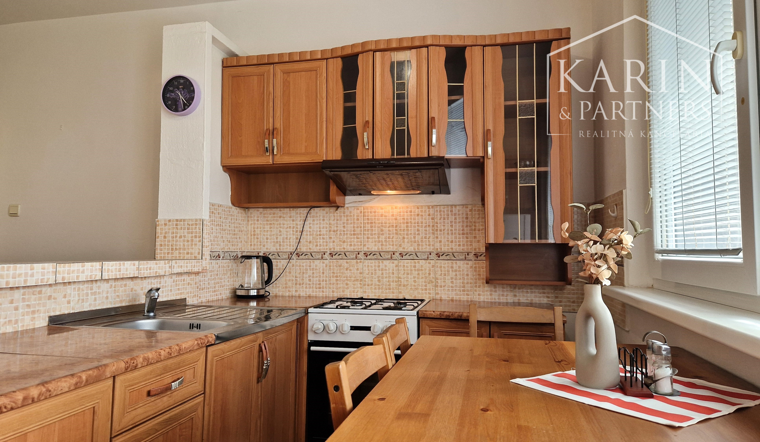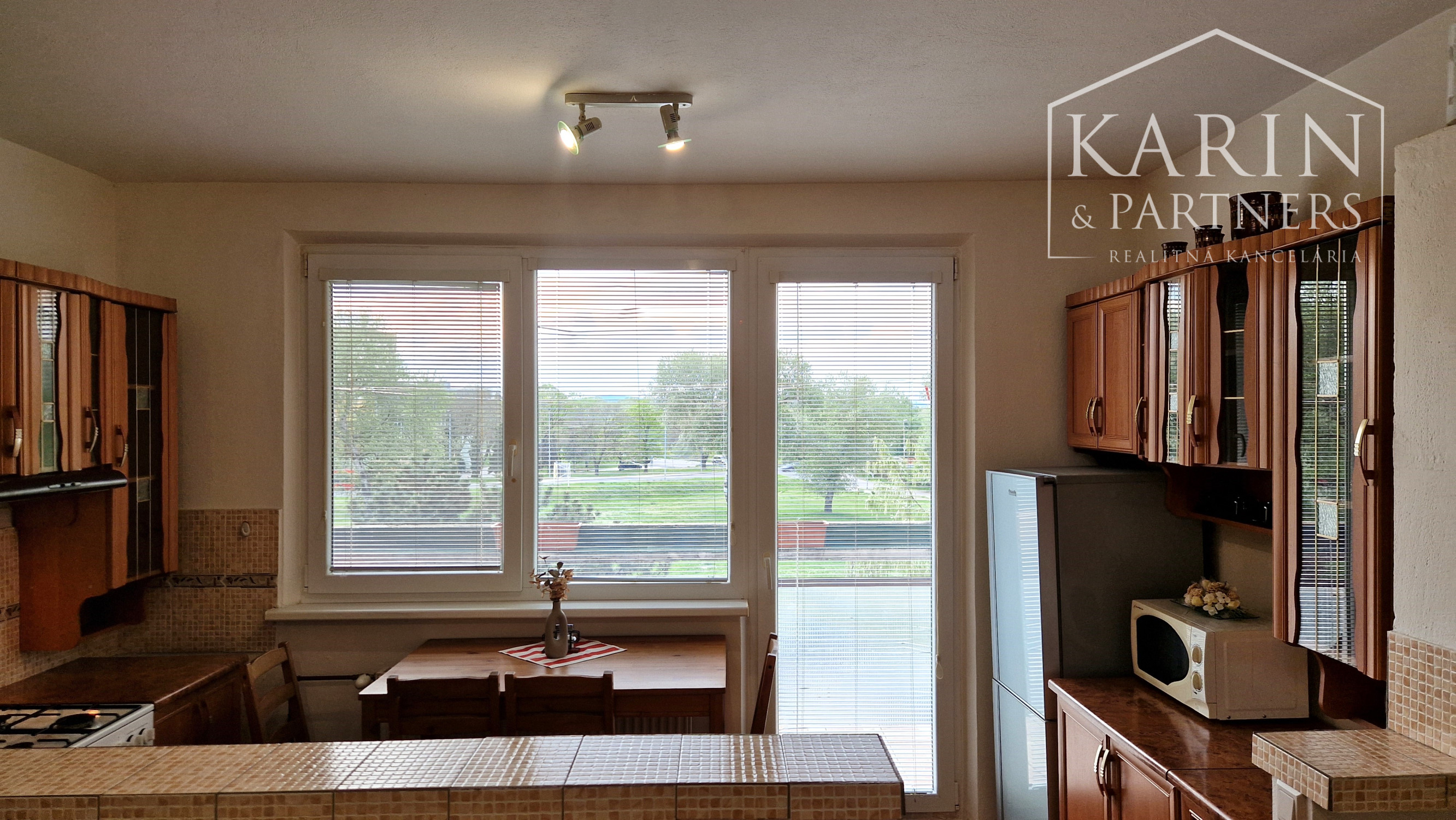 - kuchyňa vybavená spotrebičmi: mikrovlnná rúra, plynová varná doska, elektrická rúra, chladnička s mrazničkou (bez umývačky riadu), jedálenský stôl so stoličkami